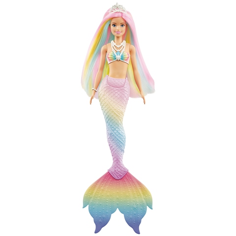 Η κούκλα Barbie™ Dreamtopia Rainbow Magic™ Γοργόνα αλλάζει χρώμα εμπνέοντας τη φαντασία των παιδιών για πολλές παραμυθένιες ιστορίες! Η Barbie® είναι μία μαγευτική γοργόνα με χρωματιστή ουρά και μπούστο με σχέδια της θάλασσας και πολύχρωμα μαλλιά διακοσμημένα με μία τιάρα. Έτοιμοι για αλλαγή χρώματος; Βυθίστε την Barbie® σε ζεστό νερό και δείτε τα μαλλιά, το μπούστο και την ουρά της να αλλάζουν αμέσως χρώμα! Βυθίστε την σε παγωμένο νερό για να επανέλθει το αρχικό της χρώμα και παίξτε ξανά και ξανά. Η κούκλα δεν μπορεί να σταθεί όρθια ή να κολυμπήσει από μόνη της.