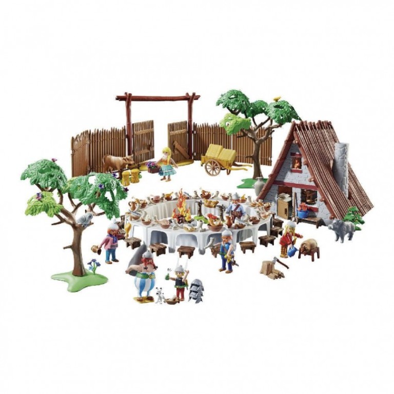 Με τον Αστερίξ, τον Οβελίξ και τον σκύλο τους Ιντεφίξ. Η καλύβα του Αστερίξ είναι επιπλωμένη και μέρος της οροφής αφαιρείται. Στο εορταστικό τραπέζι υπάρχουν θέσεις για όλους τους Γαλάτες.