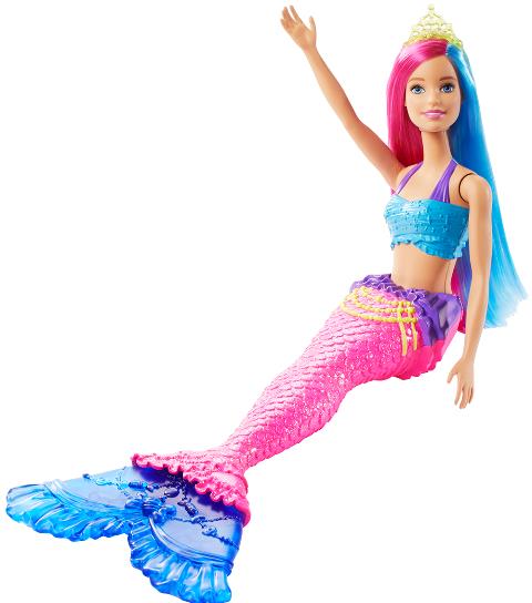 Κούκλες γοργόνες από την Barbie Dreamtopia™ με λαμπερές εμφανίσεις που εμπνέουν τη φαντασία των παιδιών για παραμυθένιες περιπέτειες! Κάθε κούκλα γοργόνα Barbie φοράει πολύχρωμο κορμάκι και έχει λαμπερή ούρα με φανταστικές λεπτομέρειες. Τα αξεσουάρ στα μακριά, πολύχρωμα μαλλιά τους ολοκληρώνουν την εντυπωσιακή εμφάνισή τους. Οι ουρές που λυγίζουν επιτρέπουν στα παιδιά να διηγηθούν δικές τους ιστορίες: "κολύμπι" στη θάλασσα ή χαλάρωση στον ήλιο. Η φαντασία των παιδιών θα δημιουργήσει ονειρεμένες ιστορίες με αυτές τις γοργόνες Barbie, γιατί μπαίνοντας στον κόσμο της Dreamtopia, τα όνειρα γίνονται πραγματικότητα! Τα παιδιά που αγαπούν τα παραμύθια μπορούν να συλλέξουν και άλλες κούκλες και παιχνίδια της Βarbie Dreamtopia για να φτιάξουν έναν ολόκληρο παραμυθένιο κόσμο.