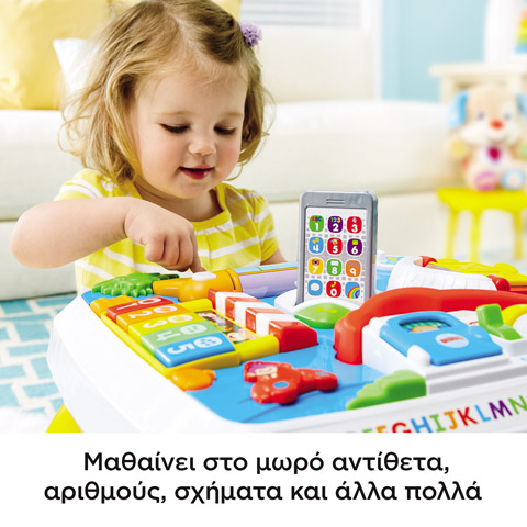 Ένα τραπέζι με πολλές δραστηριότητες σε κάθε πλευρά του για να ανακαλύψει το μωρό. Επισκεφθείτε τον ζωολογικό κήπο και γυρίστε τον κύλινδρο για να ακούσετε τραγουδάκια για ζωάκια ή πατήστε τα κουμπιά για να μάθετε λέξεις στα αγγλικά. Πηγαίνετε εκδρομή στη φάρμα και ανοιγοκλείστε την πόρτα για να σας χαιρετήσει ένας ξεχωριστός φίλος. Στην αγορά, πατήστε τα πλήκτρα για να παίξετε το πιάνο και μάθετε αριθμούς, τρόφιμα και χρώματα. Μετά, επισκεφθείτε το Σκυλάκι στο σπίτι του! Aνοιγοκλείστε την πόρτα για να ακούσετε το Σκυλάκι να τραγουδάει το αλφάβητο και γυρίστε τον διακόπτη για να μάθετε αντίθετα. Στο κέντρο του τραπεζιού, το μωρό μπορεί να πατήσει το κουμπί στο τηλέφωνο για να "τηλεφωνήσει" στο Σκυλάκι ή στην Αδερφούλα του και να ανάψει ένα νέο μέρος για επίσκεψη! Πολλές ακόμα δραστηριότητες που απασχολούν ευχάριστα το μωρό. Μεγαλώνοντας το μωρό, προσθέστε τα πόδια του τραπεζιού για να μπορεί να σταθεί και να παίζει όρθιο. Κάθε μωρό μαθαίνει & παίζει με διαφορετικούς τρόπους. Χάρη στην τεχνολογία Smart Stages™ μπορείτε να επιλέξετε το εκπαιδευτικό στάδιο που θέλετε σύμφωνα με τις ανάγκες του παιδιού σας! Αλλάξτε το επίπεδο για να αλλάξει το εκπαιδευτικό περιεχόμενο με διαφορετικές φράσεις, τραγούδια & ήχους!