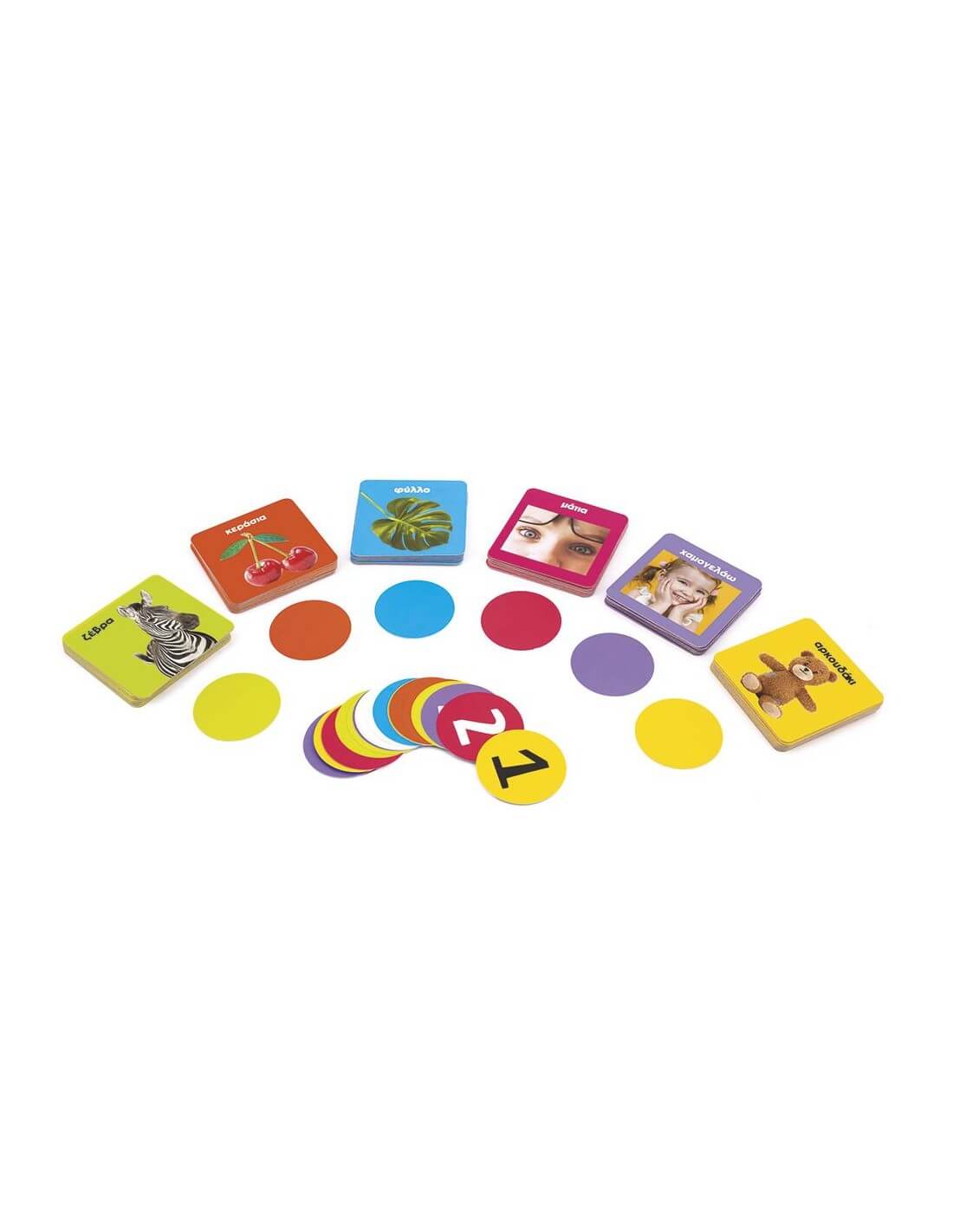 Η πιο διασκεδαστική εκμάθηση των πρώτων του λέξεων! Μέσα από αυτό το παιχνίδι το παιδί θα αρχίσει να αναγνωρίζει απλά αντικείμενα και χρώματα, μαθαίνοντας ταυτόχρονα να μετράει! Οι καρτέλες με τις εικόνες απλώνονται στο δωμάτιο, σε διάφορα ασφαλή σημεία για το παιδί. Τραβήξτε μία κάρτα και δείτε τη προσεκτικά με το παιδί. Βοηθήστε το να βρει και να μαζέψει τόσες καρτέλες, όσες υποδεικνύει ο αριθμός στην καρτα. Προσέξτε όμως, Οι καρτέλες πρέπει να έχουν το ίδιο χρώμα με την κάρτα που τραβήξατε. Διαβάστε δυνατά στο παιδί τις περιγραφές των εικόνων και βοηθήστε το να κατανοήσει τι βλέπει.