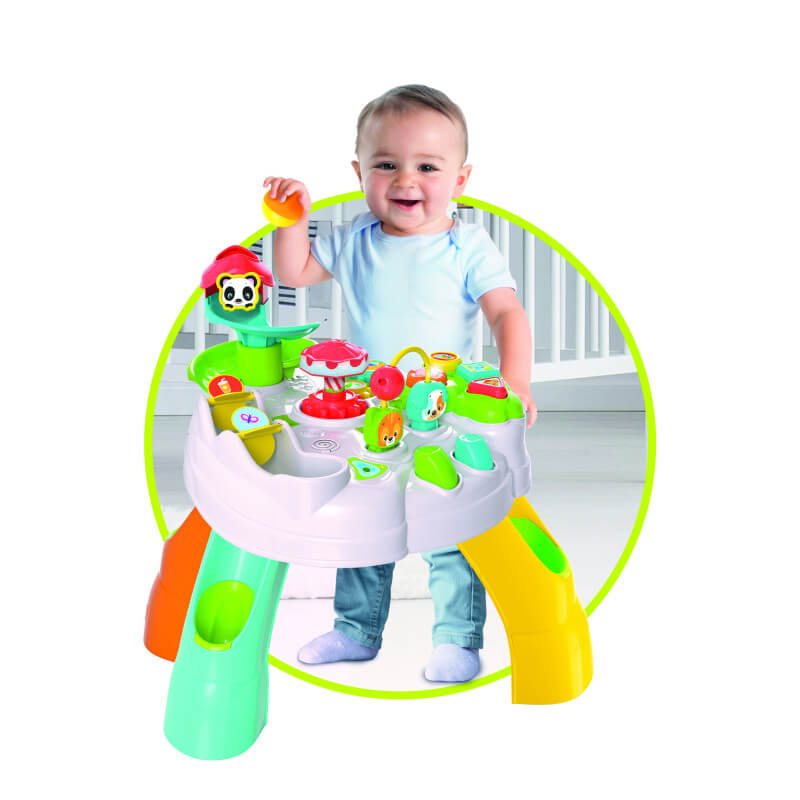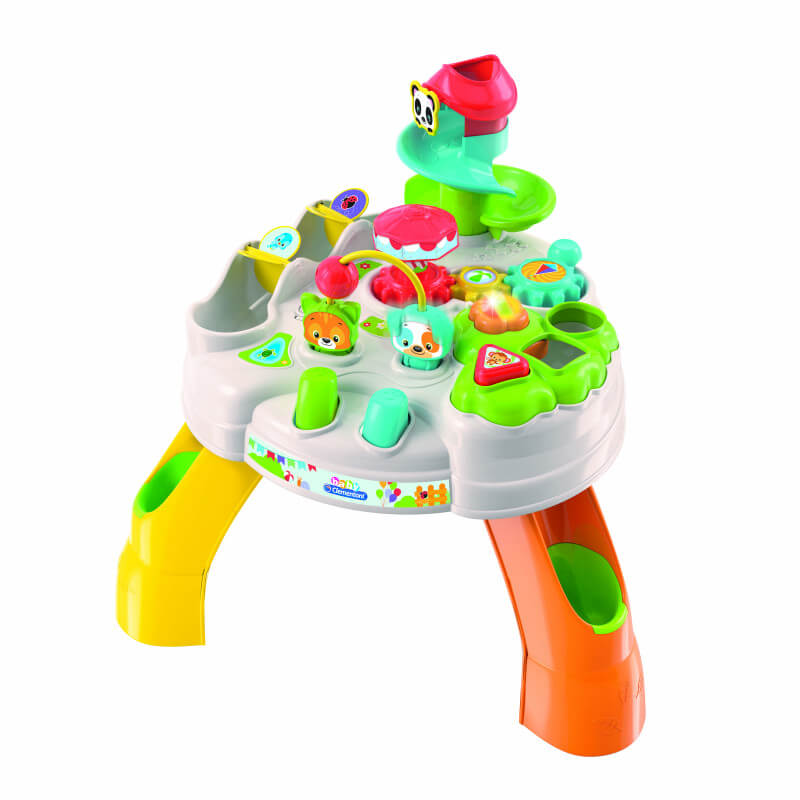 Καλώς ήρθατε στο πάρκο διασκέδασης με ζωάκια, ένα διαδραστικό ηλεκτρονικό τραπέζι με πολλές εκπλήξεις! Επισκεφτείτε τον διασκεδαστικό κόσμο του πάρκου και συναντήστε ξεχωριστούς φίλους για να ξεκινήσετε την περιπέτεια. Ανακαλύψτε μαζί τους αμέτρητες δραστηριότητες με φωτάκια, ήχους και κινήσεις! Η περιοχή ταξινόμησης των σχημάτων επιβραβεύει το παιδί με χρωματιστούς φωτισμούς, μελωδίες και ήχους που κάνουν τα ζωάκια. Πατώντας τα κουμπιά στο μπροστινό μέρος, ο σκύλος και η γάτα πηδούν από χαρά και παίζουν με την μπάλα. Το μπαλάκι ακολουθεί μια συναρπαστική πορεία με τσουλήθρες και περιστρεφόμενα στοιχεία, καταλήγοντας στα πόδια του τραπεζιού. Με τη βοήθεια του τραπεζιού, το παιδί στηρίζεται για να παίξει και μαθαίνει να σταθεί όρθιο, αποκτά καλύτερη ισορροπία και εξασκείται στο να σκύβει και να ξανασηκώνεται ρίχνοντας την μπαλίτσα στην τσουλήθρα και ξαναρχίζοντας από την αρχή. Το καρουζέλ περιστρέφεται χάρη στα κινούμενα γρανάζια. - 3 διαφορετικές περιοχές: σχήματα, τσουλήθρα και καρουζέλ - Πολλές δραστηριότητες που απασχολούν και διασκεδάζουν το παιδί όπως κουμπάκια, γρανάζια και μπάλες - Διεγείρει τις χειρωνακτικές δεξιότητες, την οπτική αντίληψη και βοηθά στην αναγνώριση της σχέσης αιτίας-αποτελέσματος - Ενθαρρύνει το παιχνίδι μίμησης για το παιδί - Κατασκευάζεται στην Ιταλία Τα παιχνίδια της σειράς Baby Clementoni βοηθούν τους γονείς να επικοινωνούν και να αλληλεπιδρούν με το μωρό από τις πρώτες ημέρες της ζωής του. Με καινοτόμο σχεδιασμό και χρώματα, μη τοξικά και ανθεκτικά υλικά, καθώς και με ανάγλυφες επιφάνειες και πολλές δραστηριότητες ευνοούν την ανάπτυξη των οπτικών, απτικών και ακουστικών ικανοτήτων, την κινητική δραστηριότητα και τους πρώτους λογικούς συσχετισμούς.