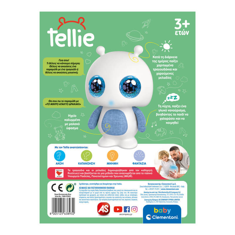 Γεια σου! Είμαι ο Tellie και προέρχομαι από ένα μακρινό κόσμο. Ο Tellie, ο πρώτος διαδραστικός χαρακτήρας με τη γλυκιά μορφή εξωγήινου που διηγείται παραμύθια, έχει μουσική και χαλαρώνει το παιδί με γλυκό νανούρισμα! Ο Tellie διηγείται 10 ιστορίες που σχετίζονται με τα 5 συναισθήματα: θυμό, αηδία, χαρά, φόβο και θλίψη. Με κάθε συναίσθημα φωτίζει σε διαφορετικό χρώμα: κόκκινο, πράσινο, κίτρινο, μπλε και μωβ. Η εναλλαγή του φωτισμού του και τα χαρούμενα τραγουδάκια για κάθε ιστορία προσελκύουν το παιδί και τραβούν την προσοχή του. Ενθαρρύνει τη φαντασία, βοηθά στην ανάπτυξη της ικανότητας ακρόασης, ενώ ακόμα μεταφέρει το παιδί σε ένα φανταστικό κόσμο μαθαίνοντας νέες λέξεις με απλό και διασκεδαστικό τρόπο! Και όταν έρθει η ώρα του ύπνου. ο Tellie δημιουργεί με το φωτισμό του και το νανούρισμά του το ιδανικό χαλαρό περιβάλλον. Ότι χρειάζεστε για τη ρουτίνα του ύπνου! - 10 ιστορίες με συναρπαστικές περιπέτειες, απίθανους φίλους και φανταστικούς κόσμους. Αφήγηση με διάρκεια μεγαλύτερη της μίας ώρας! - Λειτουργία μουσικής: Tellie παίζει πρωτότυπες μελωδίες! - Κατά τη διάρκεια της ημέρας παίζει χαριτωμένα τραγουδάκια και χαρούμενες μελωδίες, ενώ τη νύχτα παίζει ένα γλυκό νανούρισμα, βοηθώντας το παιδί να χαλαρώσει και να κοιμηθεί. - 3 διαφορετικούς τρόπους παιχνιδιού: συναρπαστικό παραμύθι, πολύχρωμη μουσική και νανούρισμα. - Τα τραγούδια και οι μελωδίες δημιουργήθηκαν από τον καθηγητή Risticucci και βασίζονται σε μια μέθοδο που αναγνωρίζεται από το ιταλικό Υπουργείο Παιδείας, Πανεπιστημίων και Έρευνας (MIUR). Σχεδιάστηκε, αναπτύχθηκε και δοκιμάστηκε στην Ιταλία.