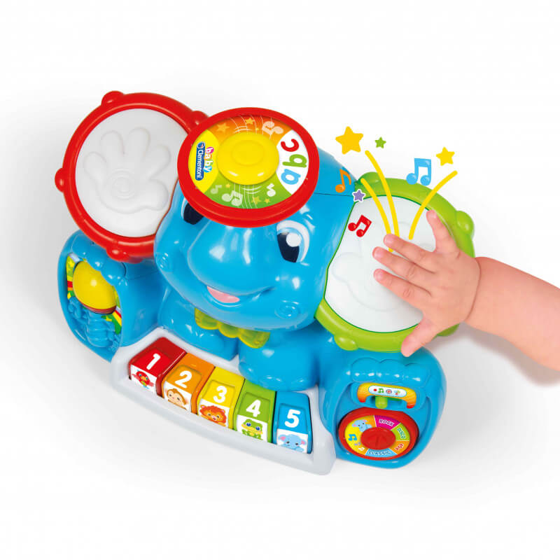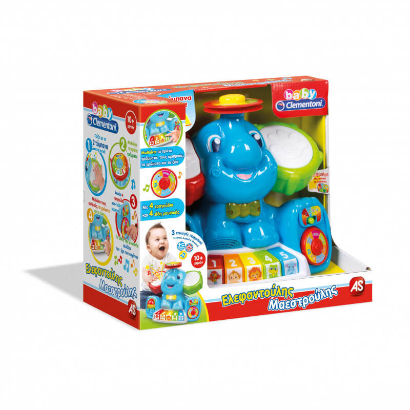 Με τον Ελεφαντούλη Μαεστρούλη, το καλύτερο φιλαράκι του παιδιού, η μάθηση γίνεται παιχνίδι! Το παιδί παίζει και μαθαίνει την αλφαβήτα, τους αριθμούς, τα χρώματα, τα ζωάκια και τις πρώτες λεξούλες στα Αγγλικά με τον πιο διασκεδαστικό μουσικό φίλο. Το παιδί μπορεί να παίζει με τα 2 τύμπανα στα αυτιά, ενώ ακόμα μπορεί να ακούσει 4 τραγουδάκια και 4 είδη μουσικής, αλλάζοντας τον ήχο των οργάνων σύμφωνα με το είδος της μουσικής που ακούγεται. Με 3 επιλογές παιχνιδιού: Ελληνικά, Αγγλικά και Μουσική. Αλφαβήτα: Παίζοντας με τα πιατίνια και τον Ελεφαντούλη Μαεστρούλη, το παιδί έρχεται σε επαφή με την αλφαβήτα μέσα από 3 ποιηματάκια Αριθμοί και ζώα: Τα 5 πλήκτρα του αρμονίου μαθαίνουν στο παιδί τους αριθμούς από το 1 μέχρι το 5, τα χρώματα, τα ζωάκια και τους ήχους τους Μουσικό κέντρο δραστηριοτήτων: Το παιδί διασκεδάζει παίζοντας διαφορετικά όργανα: αρμόνιο, πιατίνια, 2 τύμπανα (στα αυτιά) και κουδουνίστρα Επιλογή μουσικής: Πατώντας το κουμπί της μουσικής, το παιδί μπορεί να ακούσει τραγούδια και να επιλέξει 4 μουσικά είδη: ο ήχος κάθε μουσικού οργάνου αλλάζει ανάλογα με τον τύπο της μουσικής που επιλέχθηκε (Classic, Rock, Pop, Disco) Ενθαρρύνει την αισθητηριακή, ψυχοκινητική, γνωστική και συναισθηματική ανάπτυξη