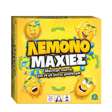 Επιτραπέζιο Παιχνίδι Λεμονομαχίες Ένα ξεκαρδιστικό παιχνίδι που θα σε….δροσίσει! Μετακίνησε τα λεμόνια ξανά και ξανά…ζούληξε το λεμόνι σου αλλά πρόσεξε…θα βραχείς εσύ ή ο αντίπαλός σου; Μάντεψε σωστά για να μην γίνεις…μούσκεμα! Περιέχει: 1 ηλεκτρονικό χρονοδιακόπτη (λετουργεί με 3 μπαταρίες ΑΑΑ - δεν περιέχονται), 4 πλαστικά λεμόνια, 9 μάρκες, 4 μάρκες διπλής όψης (ΝΑΙ-ΟΧΙ), φύλλο με αυτοκόλλητα για τις μάρκες. Για 3-4 παίχτες.