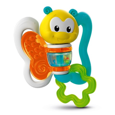 Η πολύχρωμη κουδουνίστρα σε σχήμα πεταλούδας είναι σχεδιασμένη ειδικά για μικρά παιδιά. Τα πολύχρωμα φτερά λειτουργούν σαν λαβή, το μπλε φτερό κινείται μπροστά και πίσως και οι μικρές μπαλίτσες διεγείρουν την οπτική αντίληψη.