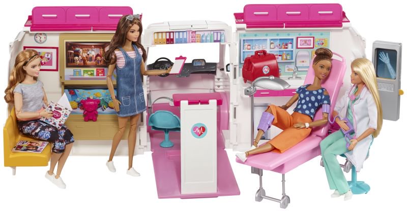 H Barbie® έρχεται να βοηθήσει με το κινητό ιατρείο - ασθενοφόρο της - απλά πίεσε το κουμπί για να ακουστεί η σειρήνα! Σήκωσε τον μοχλό στο πίσω μέρος του πολύχρωμου οχήματος για να το μεταμορφώσεις αμέσως σε ένα κινητό ιατρείο. Η Barbie® μπορεί να καλωσορίσει τους ασθενείς της στο σταντ της υποδοχής που ανασηκώνεται στο κέντρο του ιατρείου. Στα αριστερά, μπορείτε να τραβήξετε προς τα κάτω έναν κίτρινο καναπέ για να αποκαλύψετε έναν χώρο αναμονής με ένα ενυδρείο. Τραβήξτε προς τα κάτω το ενυδρείο για να αποκαλύψετε ένα μαγαζί δώρων, όπου μπορείτε να αγοράσετε δώρα όπως ένα αρκουδάκι ή ένα μπαλόνι σε σχήμα καρδιάς! Στα δεξιά, υπάρχει ένας χώρος εξέτασης πλήρως εξοπλισμένος για σοβαρά περιστατικά και απλούς ελέγχους.Το ροζ κρεβάτι εξέτασης μπορεί να προσαρμοστεί για μεγαλύτερη άνεση και επίσης λειτουργεί σαν αποθηκετικός χώρος. Αλά τραβήξτε προς τα κάτω τον μοχλό του πίνακα για ακρινογραφίες για να αποκαλύψετε ένα μηχάνημα που βγάζει ακτινογραφίες. Το σετ περιλαμβάνει αξεσουάρ για την Barbie® για να λάμπει σε κάθε έκτακτο περιστατικό, μαζί με μία ιατρική τσάντα, ένα στηθοσκόπιο, γύψο, πιεσόμετρο και άλλα πολλά! Όλα τα αντικείμενα μπορούν να διπλωθούν εύκολα μέσα στο ασθενοφόρο ώστε η Barbie® να πάει γρήγορα στην επόμενή της διάσωση με ευκολία! Περιλαμβάνεται το σετ του ασθενοφόρου με πάνω από 15 αξεσουάρ.
