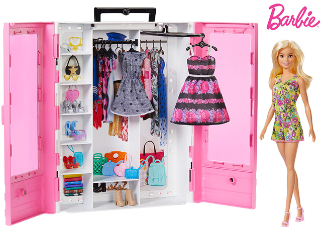 Πάρτε μαζί σας την Barbie® και την γκαρνταρόμπα της παντού! Η Ντουλάπα της Barbie δεν είναι σχεδιασμένη μόνο για να μεταφέρεται εύκολα από το χερούλι, αλλά έχει ρούχα και αξεσουάρ για πολλές ώρες δημιουργικού παιχνιδιού. Σχεδιασμένη με την υπογραφή της Barbie, η ροζ ντουλάπα έχει διαφανείς πόρτες για να βλέπετε τι έχετε μέσα. Περιλαμβάνει κούκλα Barbie που φοράει εμπριμέ ρούχα και παπούτσια. Επίσης η ντουλάπα έρχεται με άλλα μοντέρνα ρούχα και αξεσουάρ, που συνδυάζονται μεταξύ τους για πολλές διαφορετικές εμφανίσεις. Δύο φορέματα, τέλεια για πρωί ή βράδυ, με μοντέρνα κοψίματα, σχέδια και αγαπημένα χρώματα. Δύο ζευγάρια παπούτσια, δύο κολιέ και δύο τσάντες αλλάζουν το στιλ στη στιγμή. Ντύστε την Barbie® σύμφωνα με το στιλ σας ή την ιστορία που παίζετε. Δοκιμάστε άλλη εμφάνιση για μία νέα ιστορία. Διαλέξτε ένα νέο σκηνικό και μεταφέρετε εκεί το παιχνίδι σας. Με έξι κρεμάστρες για τα ρούχα και πολλούς χώρους για τα αξεσουάρ. Η ράγα με τις κρεμάστρες βγαίνει έξω για περισσότερη διασκέδαση με τα ρούχα. Η ντουλάπα μπορεί να μεταφερθεί παντού για αμέτρητες δημιουργικές ιστορίες, γιατί όταν ένα παιδί παίζει με την Barbie®, φαντάζεται όλα όσα μπορεί να γίνει όταν μεγαλώσει. Περιλαμβάνεται ντουλάπα, κούκλα Barbie με ρούχα και παπούτσια, δύο φορέματα, δύο κολιέ, δύο τσάντες, δύο ζευγάρια παπούτσια και έξι κρεμάστρες. Τα ρούχα χωράνε στις περισσότερες κούκλες Barbie®. Τα χρώματα και τα σχέδια μπορεί να διαφέρουν.