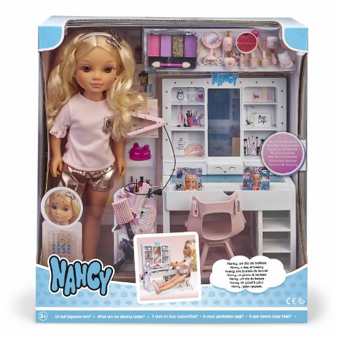 Τι παίζουμε σήμερα; Κάθε μέρα και διαφορετικό παιχνίδι, με την Nancy, την αγαπημένη φίλη των παιδιών! Σήμερα η μέρα είναι αφιερωμένη στην ομορφιά! Μαλλιά, μακιγιάζ, νύχια, όλα πρέπει να είναι τέλεια! Μεγάλο σετ παιχνιδιού με περισσότερα από 20 αξεσουάρ που περιέχει: 1 κούκλα Nancy ύψους 43 εκ. με ρούχα, κορδέλα μαλλιών & παπούτσια, τουαλέτα ομορφιάς με καθρέφτη, συρτάρια και ράφια, καρέκλα για την κούκλα, σκιές ματιών (κατάλληλες για την κούκλα αλλά και το κοριτσάκι), αξεσουάρ ομορφιάς (χτένες, μπουκαλάκια "καλλυντικών", σίδερο μαλλιών, σεσουάρ κ.α.). Μεγάλο σετ παιχνιδιού με θέμα την ομορφιά. Με μεγάλη κούκλα ύψους 43 εκ. με πλούσια, μακριά μαλλιά. Πάνω από 20 διαφορετικά αξεσουάρ.